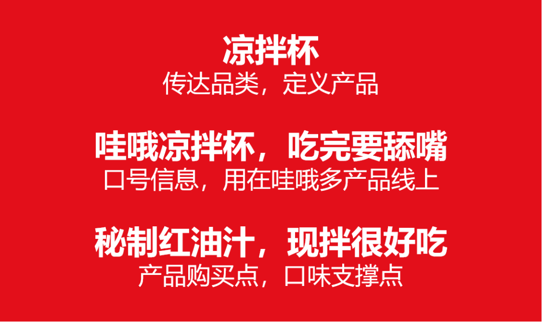 凉拌杯产品话语由三部分组成,第一部分是展示品类,并告诉消费者我们这个新产品到底是什么:也就是凉拌杯三个字。