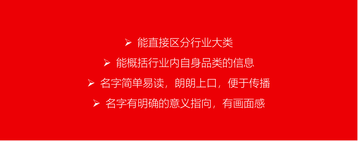我在第一篇文章讲品牌的本质时,就说了品牌的目的,品牌是为了降低消费者选择成本,所以自然的,品牌名必须服从这一原则。始终记住这一条原则的目的是为了传播和记忆,节省消费者成本,和企业自身的投资成本。