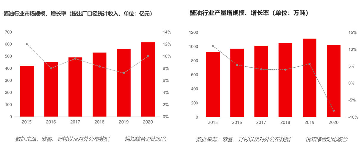 中国酱油市场2020年规模为600亿左右,产量为1000万吨左右,其中销售增速为8%左右,产量增速在5%左右。销售增速和产量增速均在逐步下降,维持在较低增长水平,酱油行业已经属于非常成熟产业。