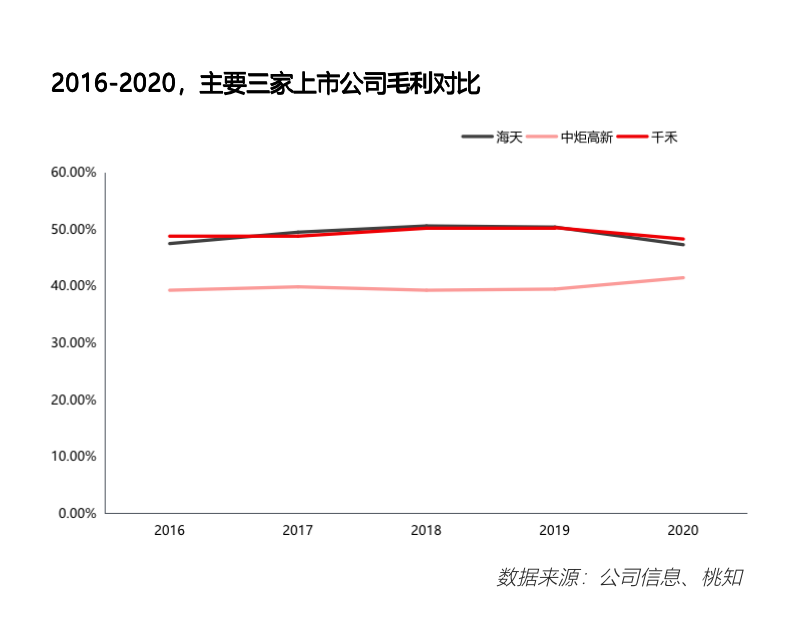行业增量不高,对于新进入者没有优势,仍然是在和存量者竞争。我们再看行业主要上市公司品牌的营收情况,其中海天酱油业务收入增速(2020年)为12.2%;中炬高新(厨邦)酱油业务收入增速为12.7%;千禾酱油业务增速为26.2%;加加酱油业务略微负增长。总体看下来,头部企业维持较高速增长,并且增速超过行业平均增速,进一步证明行业加速集中。
